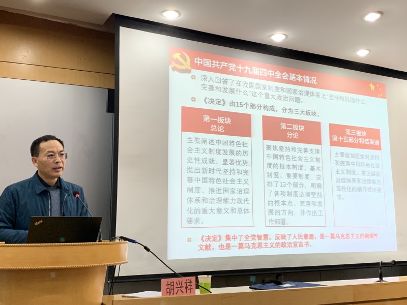 宣讲会上,胡兴祥结合自己的学习和思考,围绕“为什么党的十九届四中全会要以国家制度和国家治理体系建设为主题、并集中全党智慧深入研究这个问题”“怎样正确认识和把握党中央对《决定》稿的总体考虑、基本框架和总论部分的核心要义”“怎样正确把握《决定》分论部分‘十三个坚持和完善’”等问题,深入阐释了党的十九届四中全会的重大意义,深刻阐述了中国特色社会主义制度和国家治理体系的显著优势,对《决定》提出的总体要求、总体目标和重点任务进行了系统解读,对全面落实全会提出的目标任务指出了方法路径。