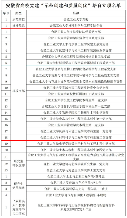 在此次党建示范创建和质量创优工作中获得佳绩。学院党委入选全省高校党建工作“标杆院系”,金属材料工程系教师党支部、本科生第二党支部入选全省高校党建工作“样板支部”。同时,学院材料物理与新能源材料系教师党支部获批安徽省高校“双带头人”教师党支部书记工作室。