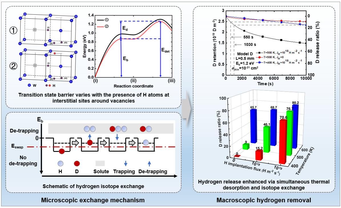 孙飞教授和硕士生郝铖等基于多尺度方法研究了氢同位素的交换行为,研究发现氢同位素交换将受到三种效应的协同驱动:竞争性重捕获、碰撞、置换。将氢同位素交换与传统热解吸法相组合可以显著降低所需的氢去除温度,并增强去除速率。该成果为理解和设计未来聚变堆材料中的除氚工艺提供了理论依据。