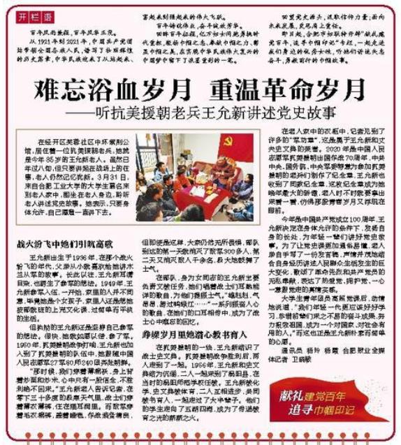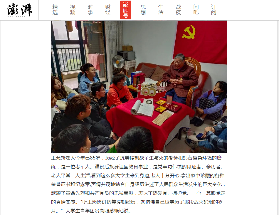 在与老人聊天的过程中,同学们也了解到,王允新老人在退役后仍在为祖国建设发光发热。她积极投身祖国教育事业,见证改革开放四十多年来新中国所取得的伟大成就。即使已步入耄耋之年,老人仍然关心着国家的发展,与同学们畅谈国家科研事业的发展。听完老人的故事,同学们眼中都流露着浓浓的敬佩之情。“今后的我一定有一份光,发一份热,在我力所能及的范围内一定发挥不怕吃苦不怕累的‘为人民服务’的精神,为祖国的事业添砖加瓦。“团支书刘邦琪同学感慨到。