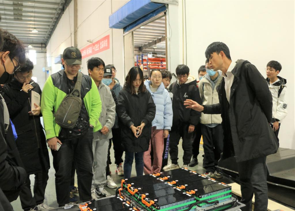 在讲解员的带领下,同学们依次参观了产品制造部的PACK线、电芯三部等生产车间,从对锂电池的分容、分压、配组、到最后的测试、出库,进行了详细的了解。在生产线上,机械臂平稳有序地运行,一旁的工作人员也着装整齐在各自的岗位上专注工作。在电芯三部,同学们参观了52Ah的单体电芯生产线,从激光制片工序,卷绕热压工序,组装整线工序,激光焊接工序,化成分容工序到最后的成品出线,进行了细致观看和了解。参观学习过程中,同学们专注看,认真听,用心记,详细了解具体专业技术操作时会主动提问讨论,展示出同学们对材料类专业高新科技发展方向的憧憬与热情。