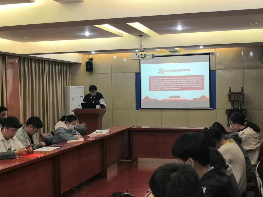 同学们前期通过阅读原著、查找解析的方式进行了自学。会上,麻震同学介绍了《实践论》《矛盾论》的写作背景、写作目的,阐述了两本著作对人类历史的贡献和现实意义。随后,全体成员集中观看了中央党校对于两部著作的解读视频,经讨论交流后进一步加深了理解。最后,各党小组对党员思政学习进度进行了检查,并布置了本月后续相关学习安排。