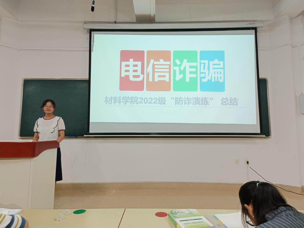 9月28—29日,反诈演练工作小组成员以班级为单位开展“网络诈骗”主题班会,详细介绍本次新生反诈演练结果、秋季学期校内诈骗案件统计、大学生常见诈骗类型与防范技巧。材料类22级学生表示,将吸取此次活动的经验教训,一旦涉及个人私密信息或金钱转账,一定要三思而后行,多问问自己的老师家人,不能贸然相信互联网对面的人。