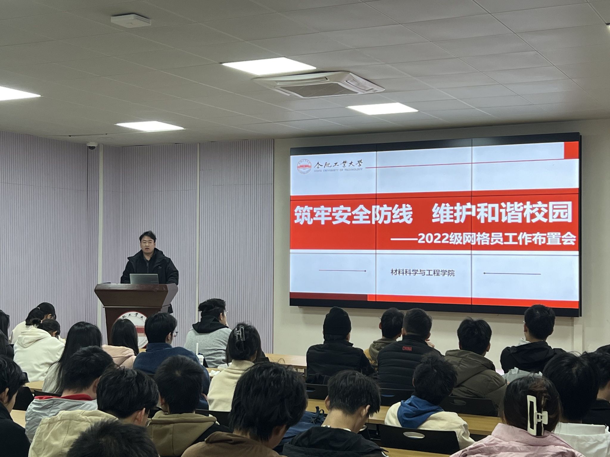 在翡翠湖校区综合楼一楼报告厅开展“筑牢安全防线 维护和谐校园”网格员工作布置会,2022级全体网格员、心理委员、生活委员参与本次活动。