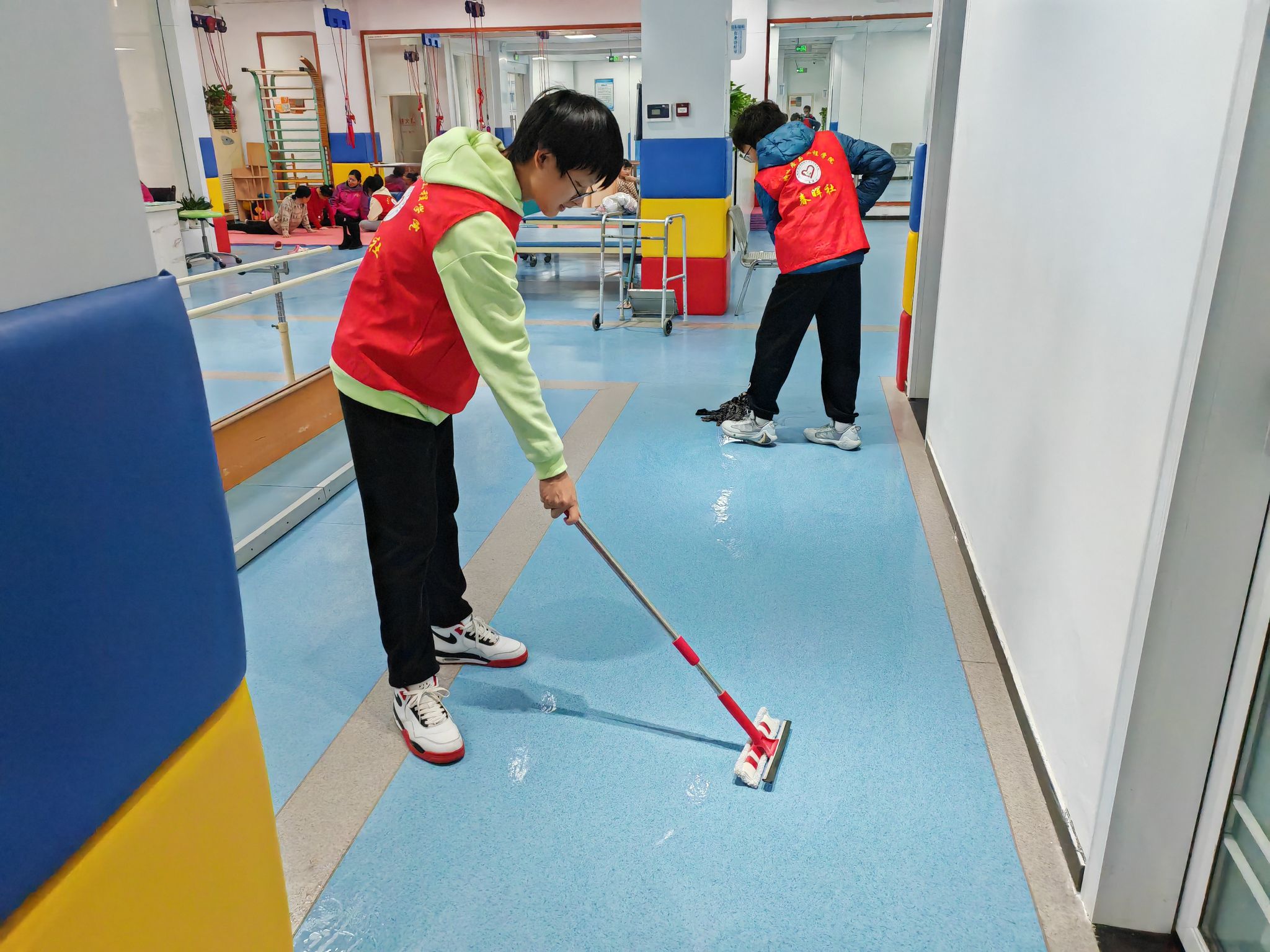 到达康复中心后,志愿者在工作人员指导下进行了分组,并认领了不同的工作任务。随后,志愿者积极参与海绵垫等训练道具的清洁工作中,浸泡、刷洗、冲洗、晾干,在大家的相互配合下,将康复中心很快收拾得干净整洁、井然有序。
