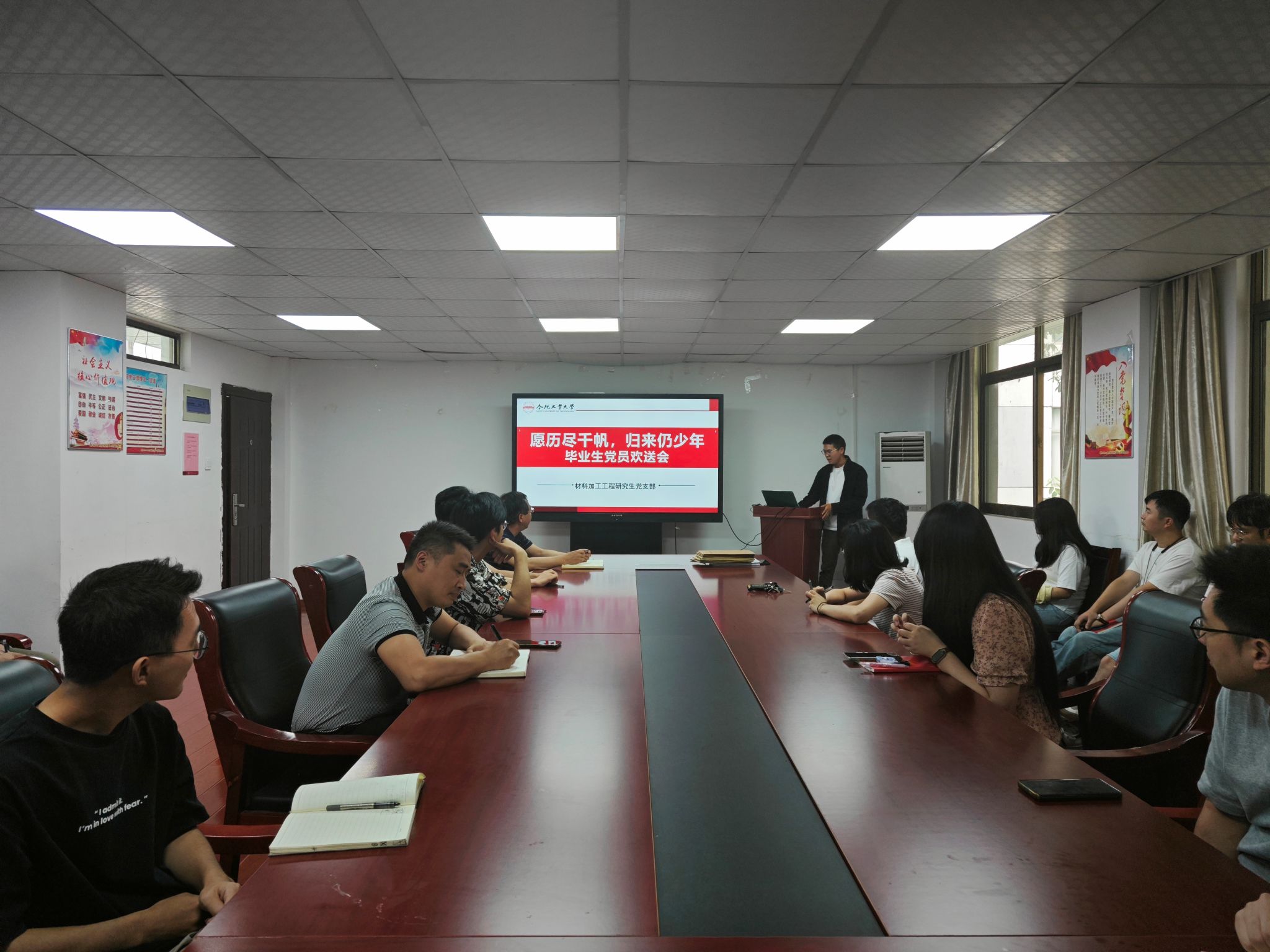 材料加工工程研究生党支部在学院党员之家举办了主题为“愿历尽千帆,归来仍少年”的毕业生党员欢送会。此次活动旨在欢送即将踏上新征程的毕业生党员,增进党支部成员间的情谊,同时也激励在校党员继续努力奋斗。学院副处级组织员徐经忠参与了此次活动,并为毕业生们送上了殷切祝福。