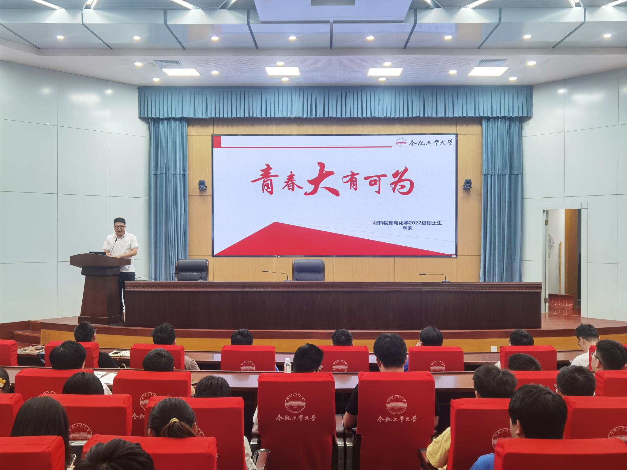 在主题分享环节,博士生魏国庆、硕士生李响结合自身经历,围绕研究生阶段生涯规划、读博经验、科研竞赛等方面展开分享。其中,魏国庆就博士的分类、申博经验、如何选择导师以及毕业要求等作了详细报告。李响分享了参加研支团升学到本校读研的故事,展示了自己的研究生阶段计划表,鼓励同学们在研究生阶段可以多参加一些活动来丰富自己的读研生活,并尽早做好生涯规划。