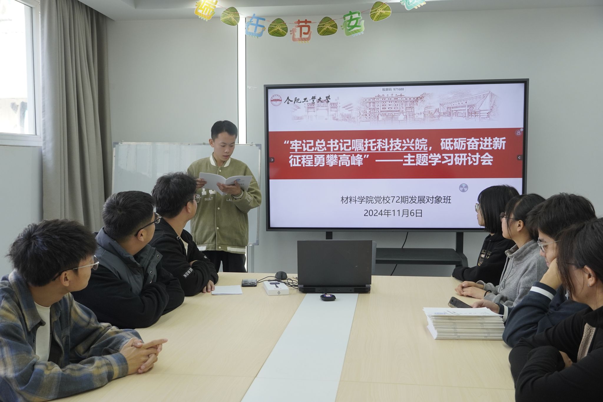 在翡翠湖校区4号学生社区组织开展了“牢记嘱托科技兴皖,砥砺奋进勇攀高峰”主题学习研讨会。学院党校第72期发展对象班全体学员参与本次研讨。