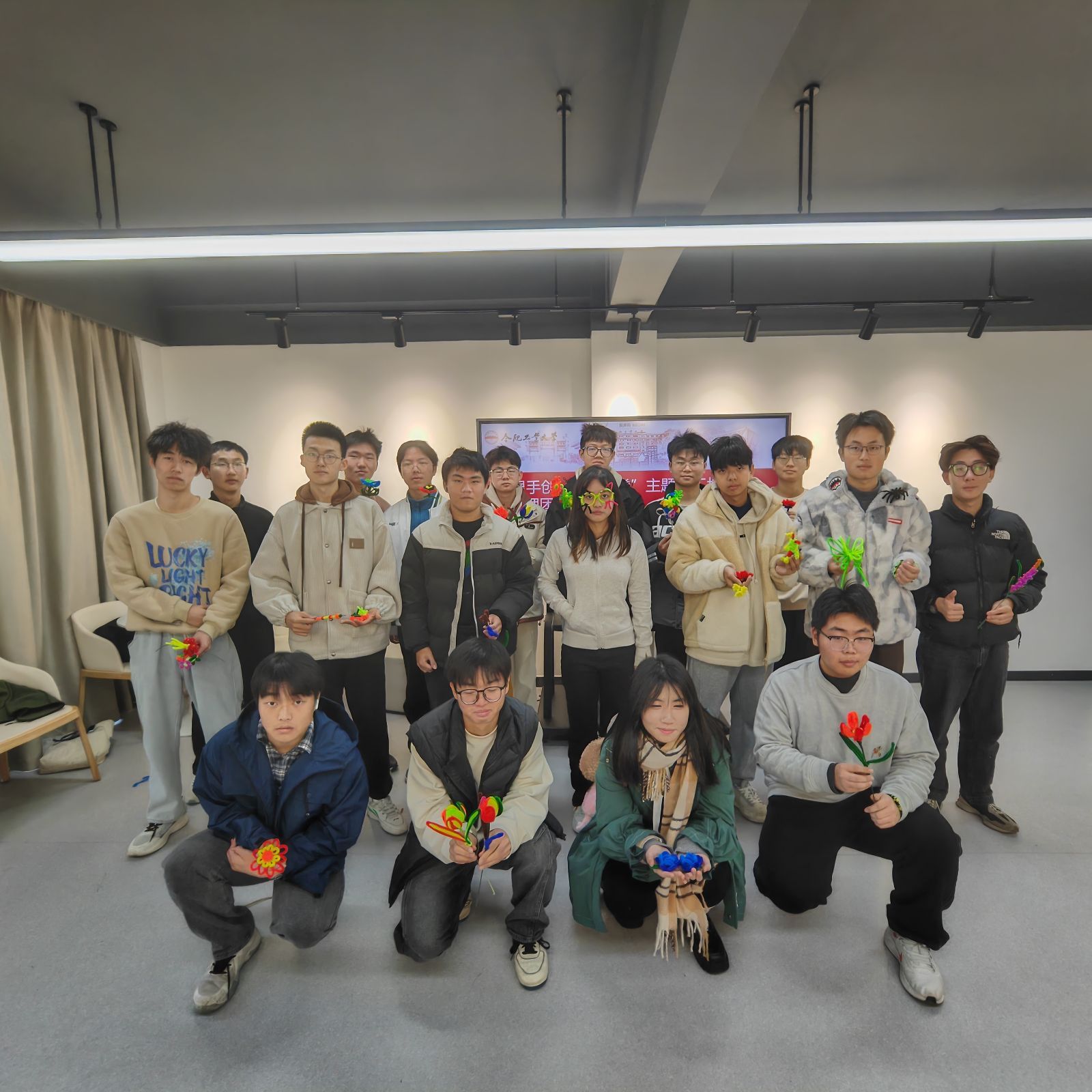 活动中,由心情社作为演示单位,向现场人员讲解“心育+美育”的心理趣味工作思路,并以扭扭花创作为例,进行手工制作、创意分享的演示。随后,现场有序分发扭扭棒、剪刀等制作材料,同学们纷纷发挥各自创意,制作出多样且美观的扭扭花,现场气氛融洽。制作完成后,全体成员将创意作品拼接成花束并合影留念。