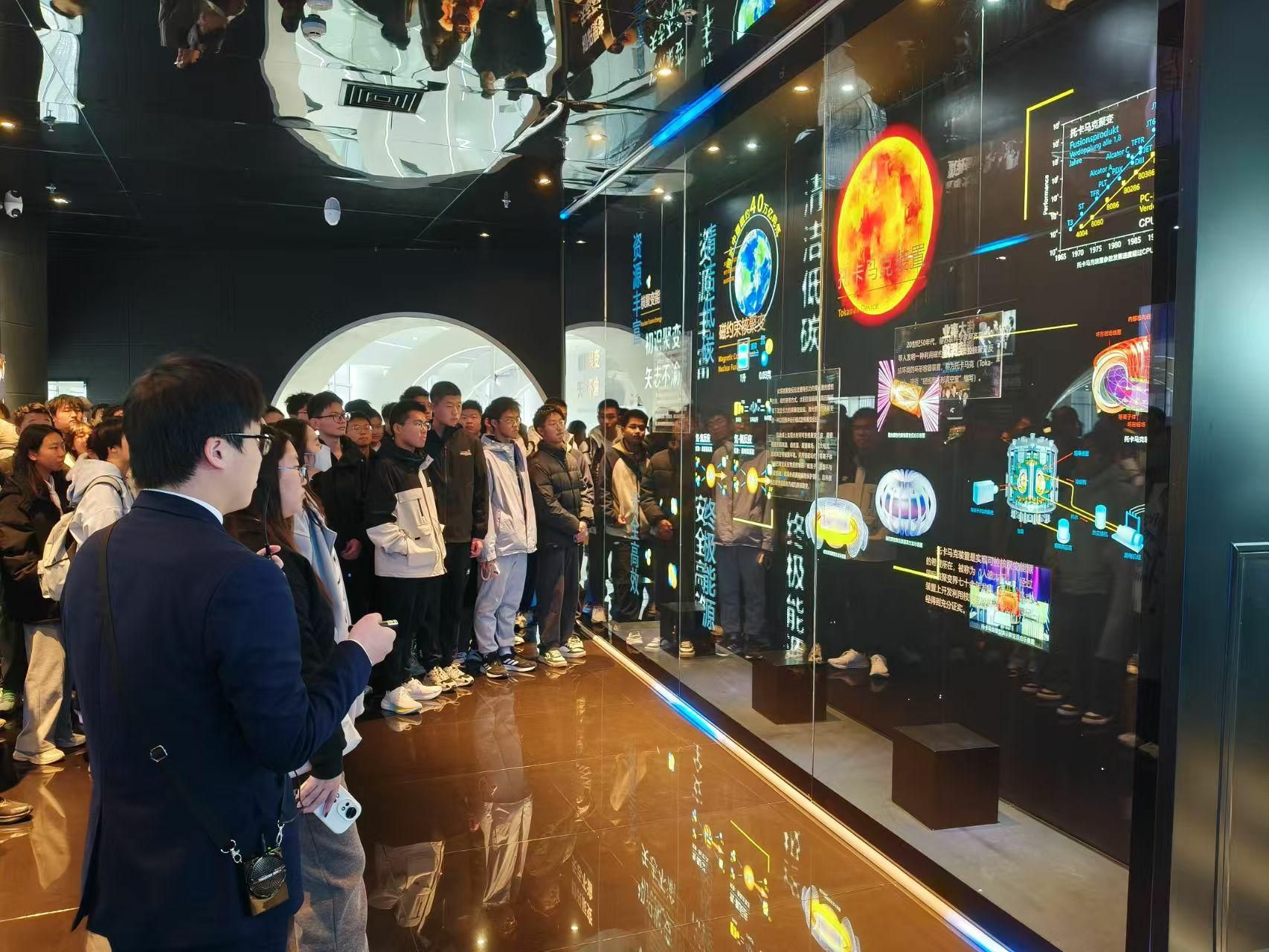 随后,学院师生一行来到全国科普教育基地、聚变创新展览馆参观学习。在讲解员带领下,同学们依次参观了“聚变印象”“聚变科普”“聚变征程”“聚变成果”“聚变未来”等五个部分,馆内沉浸式数字沙盘、立体全息影像、立体形象宣传影片等现代声光电技术,展示出了磁约束核聚变大科学团队坚守初心、开拓创新,不懈追逐人类聚变能源梦想的奋斗历程。在参观过程中,老师们耐心解答同学们的疑问,进一步激发了大家对材料科学与固体物理交叉领域的研究兴趣。