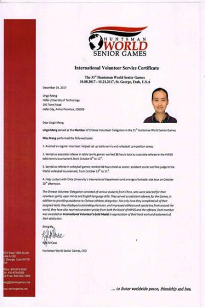 成绩优异的孟令孜,一直热心公益,坚持利用课余时间以及寒暑假参加志愿活动。2017年10月,经过推荐选拔和考试,孟令孜以中国志愿者身份参加第31届亨斯曼世界中老年运动会。志愿服务期间,多次在关键时刻勇挑重担,最终获得赛事主办方特别颁发的国际志愿者金牌奖章和证书。据悉,在参加31届运动会的2500多名志愿者中,仅有9人获此殊荣。