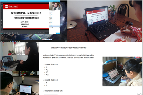 调研把脉,心理疏导,呵护象牙塔外的身心健康。疫情当前,学院各年级辅导员积极向校外的大学生们宣传贯彻疫情防控工作的官方文件精神和工作措施,转发权威消息,传播科学防控知识,积极开展“我为武汉加油”线上防疫知识宣传,召开“疫情无情、人有情”主题班会,积极为防疫发声。同时,学院辅导员们群策群力,积极制定《关于疫情期间的相关问题调研》问卷,对全院学生开展调研,了解同学们的心理状况,针对学生在疫情防控期间心理调适、情绪管理、谣言应对、线上学习、居家生活中可能产生的各种心理状况,传授疫情防控心理自助与疏导的知识,组织同学们在线学习“防疫健康教育知识课”,开展疫情防控专题心理健康辅导,帮助学生培育理性平和的心态,提高情绪调控能力,提升破解网络谣言的能力,及时向学生传递关心和关爱,呵护同学们的身心健康。