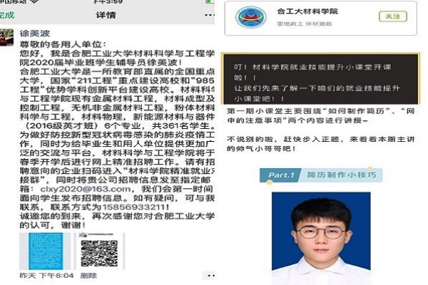 精准就业对接群”,截止到目前为止,已与近70家企业取得联系,为网络精准就业做好充分准备。针对就业技巧方面,在毕业班成立了“就业技能提升小战队”,录制技能提升小课堂系列视频,为待就业的同学们提供就业经验分享,提高就业技能,提前做好迎接春招的各项准备。为帮助学生提高就业信心,毕业班辅导员还一对一在线帮助学生修改简历。一系列创新举措,大大提升了线上就业的实效。