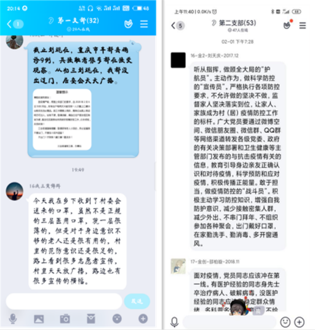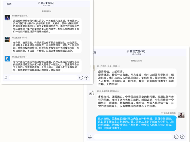 各支部党员同学,结合在疫情防控中看到听到的感人事迹和震撼事例,开展了深刻生动的线上学习讨论。大家谈体会、谈感想,相互交流,相互鼓舞,让思想得到升华,让党性更加坚定。
