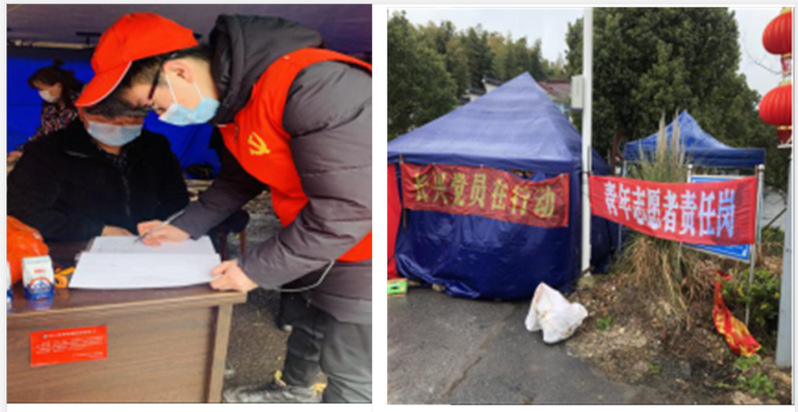 学生党员周霆宇正在浙江省湖州市长兴县龙山街道后夹山村(水库路口)疫情防控监测点登记出入村口人员、车辆信息,简陋的党员值班岗并不影响值班防疫的工作热情。此刻的他正在有条不紊的配合其他工作人员对进出村子的所有人员一一登记、测量体温,与此同时他也不断的向过往的行人普及着疫情防控知识;看到出入村口人员数量的显著减少他说自己很开心,感觉前期的疫情防控宣传工作取得了成效。
