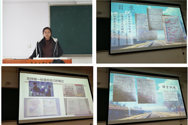 学习分享交流环节,来自金材18-2班的宋晓戈这样说到:“学习笔记包含内容可以分为三类,分别是课堂笔记、自学笔记、复习笔记,课堂笔记主要以课堂知识记录为重点,自学笔记则以经典易错题、疑难问题解析为目的,复习笔记主要用于系统复习时的知识梳理和归纳,便于系统的掌握一门学科的知识,好的笔记可以使自己的学业事半功倍。”