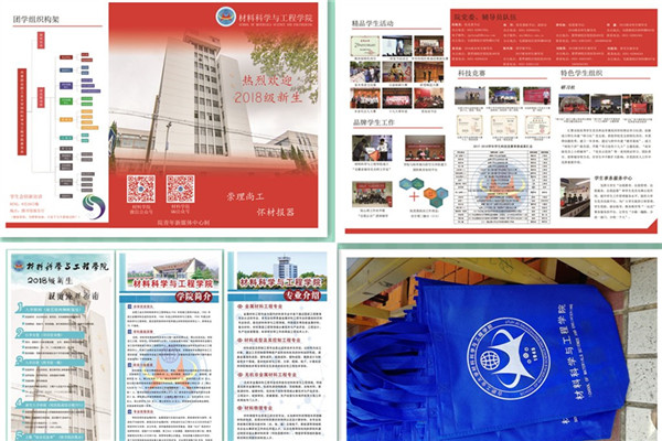 精品学生活动、品牌学生工作、特色学生组织和科技竞赛情况,院青年新媒体中心为学院每一位新生“私人订制”了带有学院特色的迎新专刊折页,折页封面以材料楼作为主图片,以主教楼砖红色作为主基调,学生组织构架版块制作院徽水印,强化学院自信,封面底脚和内页分别印制了学院院训和“双引领三融合”学生工作育人理念。
