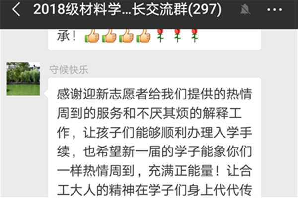 迎新当天,67名身穿红色马甲佩戴红色帽子的志愿者在建艺馆、图书馆、校医院、宿舍楼、综合楼等地来回奔波。炎炎烈日,他们汗流浃背,但从未抱怨,他们以自己的实际行动为新生上了生动的一课,他们有一个共同的名字——春晖社。迎新期间,他们从路线指引、信息咨询到行李搬运,志愿者们的辛勤付出和微笑脸庞,让新生感受到了青春的正能量,一幕幕温馨感人的迎新画面在校园里真情呈现。迎新结束了,新生家长群内被同一个消息刷屏了,家长亲切的说道“非常感谢迎新志愿者给我们提供的热情周到的服务和不厌其烦的解释工作,让孩子们能够顺利办理入学手续,也希望新一届的学子能像你们一样充满正能量,让合工大精神在学子身上代代传承。”