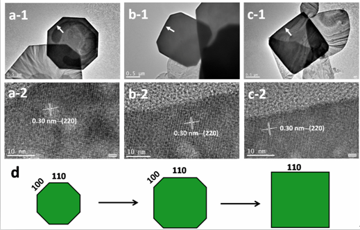 图4.四方相CsPb2Br5纳米片形状由正八边形到正方形演变的TEM及HRTEM照片,及相应的演变示意图。