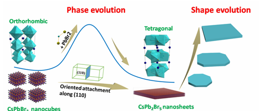 图3.由正交相CsPbBr3纳米立方块到四方相CsPb2Br5纳米片发生的相和形貌演变过程的示意图。