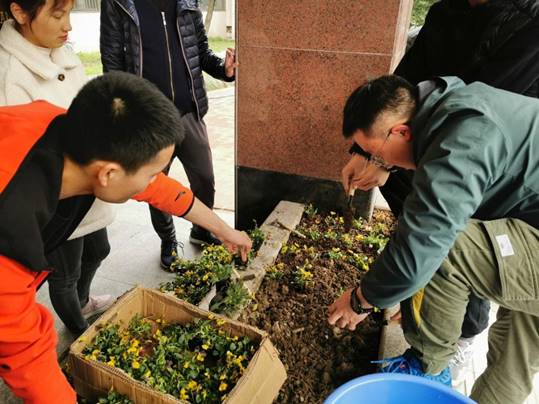 本次活动以团支部承包形式开展,针对材料楼前花坛征集院内志愿“种花小队”。队伍一经成立,各组成员纷纷行动,部分同学搜集花卉种植养护要点,部分同学负责花卉挑选与运输,部分同学负责花坛松土浇水,共同为此次花卉栽种做好充分准备。在师生共同讨论下,最终敲定购买颜色鲜艳,适应性强的三色堇进行种植。