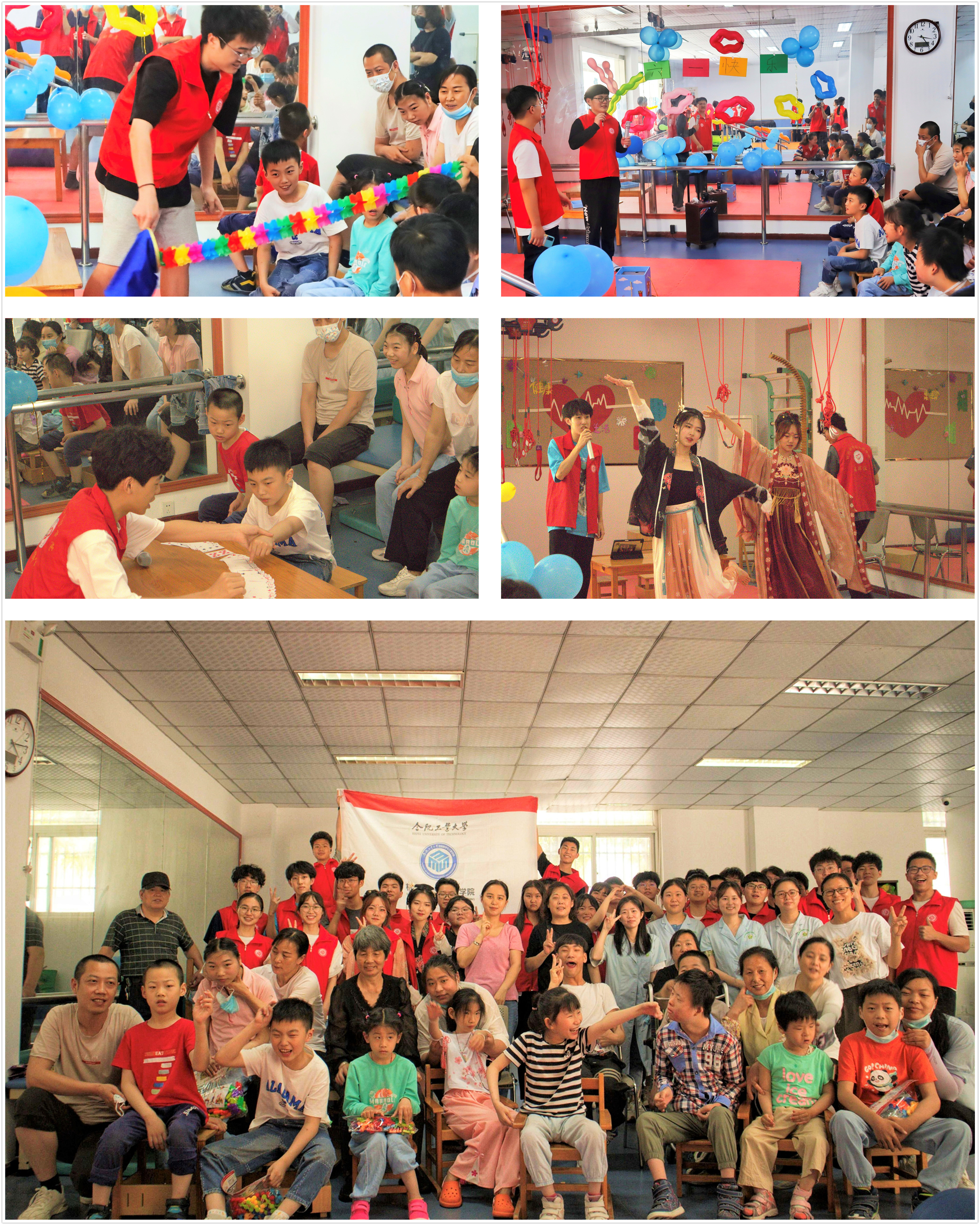 与合肥市残疾儿童康复训练中心联合举办的第四届儿童节联欢会,也是学院“茧·爱”助残志愿服务项目的重要内容,旨在通过联欢会的形式让脑瘫儿童及其家庭感受到来自社会的关怀与祝福,勉励他们自立、自强、自信,乐观坚定地面对困难,同时教育引导青年大学生进一步弘扬“奉献、友爱、互助、进步”的志愿服务精神,增强同学们的社会责任感,传递社会正能量。
