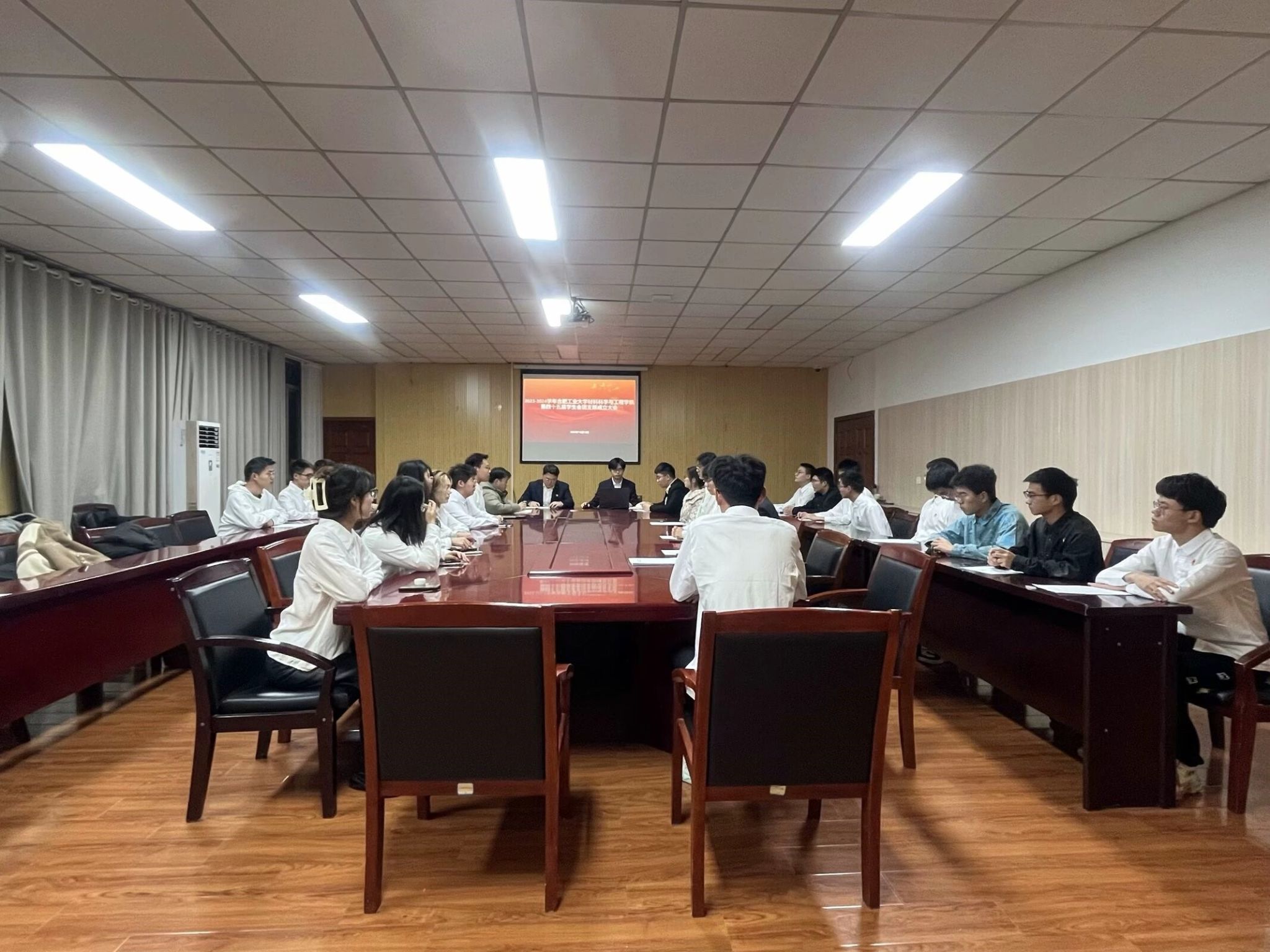 第四十五届学生会临时团支部成立大会,学院学生会指导老师唐锴和学生会全体成员按时参加会议。