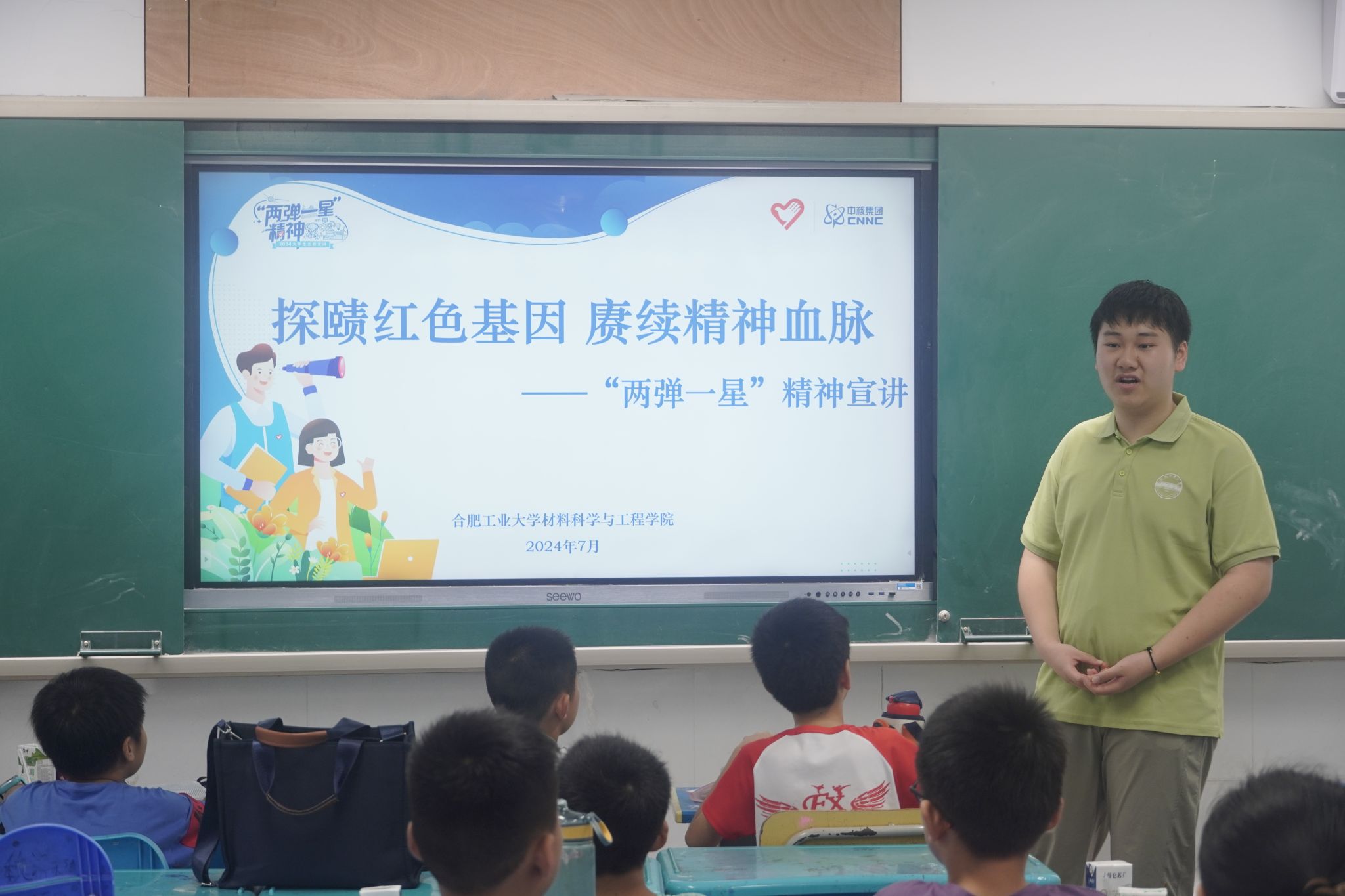 “青春飞扬,筑梦翱翔”大学生志愿支教团队,赴肥西县三河镇政府中心学校开展科普宣讲思政课。课程向学生们普及“两弹一星”精神内涵,引导学生们树立正确的价值观和人生观,厚植爱国情怀。