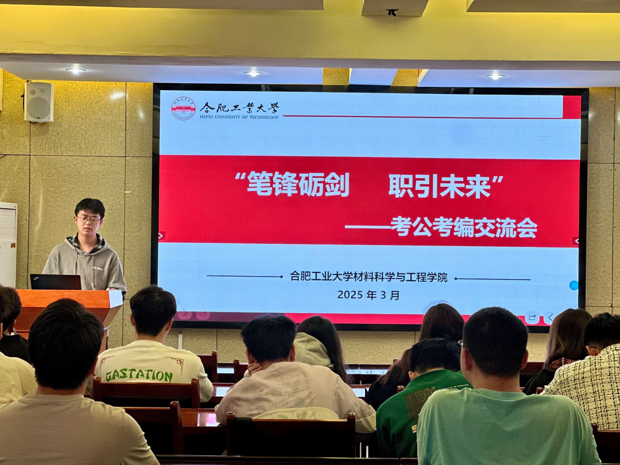 在材料楼三楼多功能厅举办 “笔锋砺剑职引未来”考公考编经验交流会。本次活动充分发挥优秀毕业生传帮带作用,特别邀请国考上岸的2022届毕业生张钊鹏担任主讲。