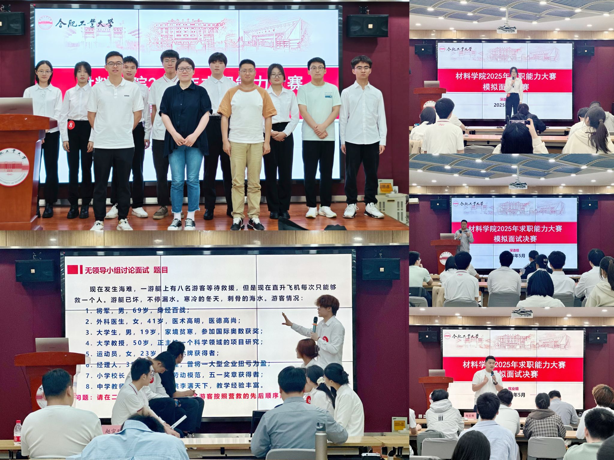 决赛特邀学院材料成型与控制工程系宋奎晶副教授、金属材料工程系潘亚飞副教授、材料物理及新能源材料与器件系宋晓辉副教授担任深造组评委;邀请晶合集成电路股份有限公司招募主任管理师夏邦栋、合肥新东方大学事业部招聘负责人赵宣臻担任就业组评委,联动“校企双导师”分别开展深造组和就业组决赛。深造组重点考察参赛选手科研潜质与学术思维,设置理论基础考察、科研经历介绍、英文问题问答等环节;求职组则通过结构化面试、无领导小组讨论等真实场景,着重评估选手职业匹配度与问题解决能力。最终张译文、宁紫奥等5人获得一等奖,何婷、田志等6人获得二等奖,徐崇高、王宇航等6人获得三等奖。