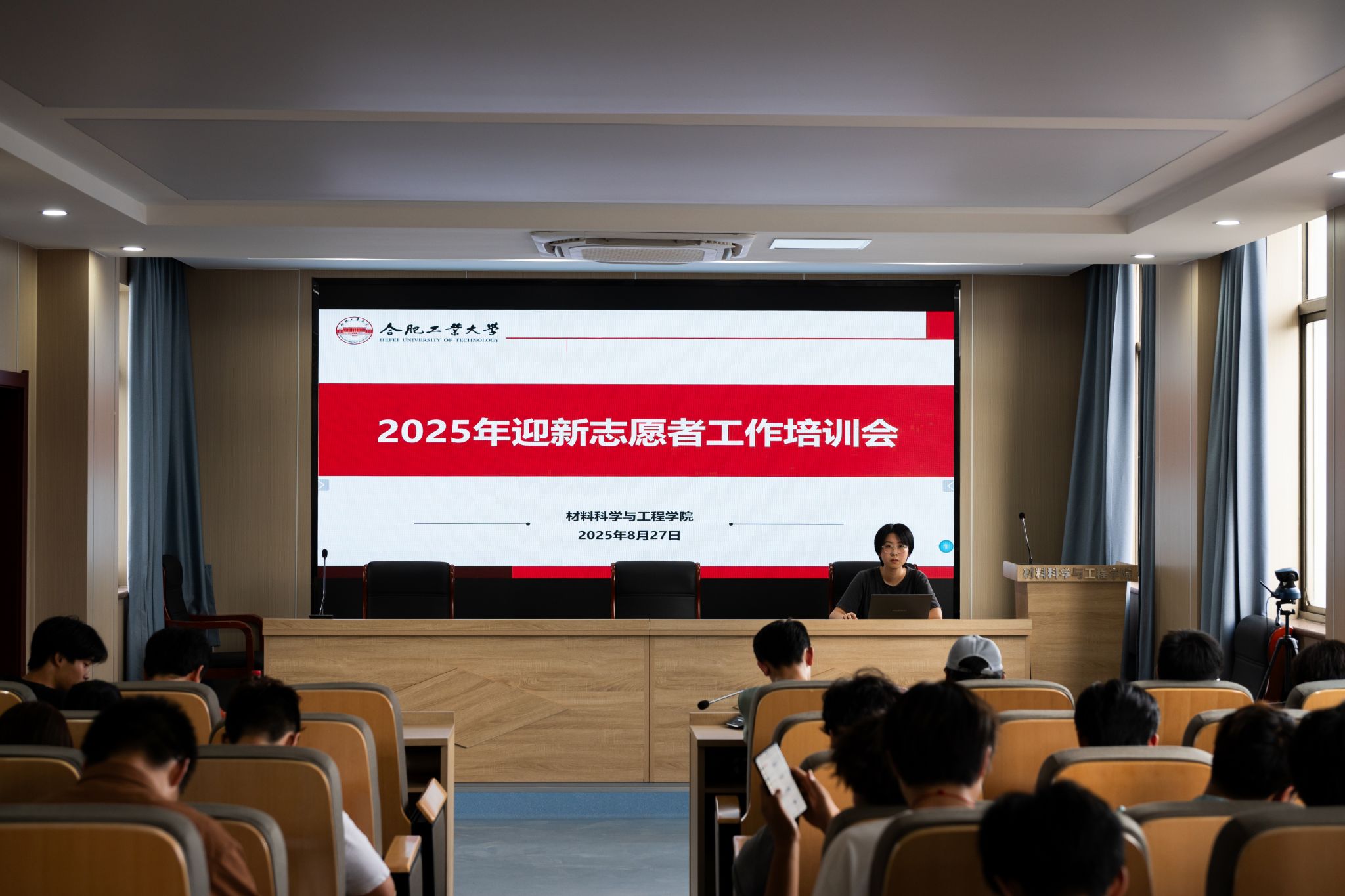 在屯溪路校区材料楼会议室组织召开2025级本科生迎新工作志愿者培训会。学院相关负责人和70名学生志愿者参加本次会议。