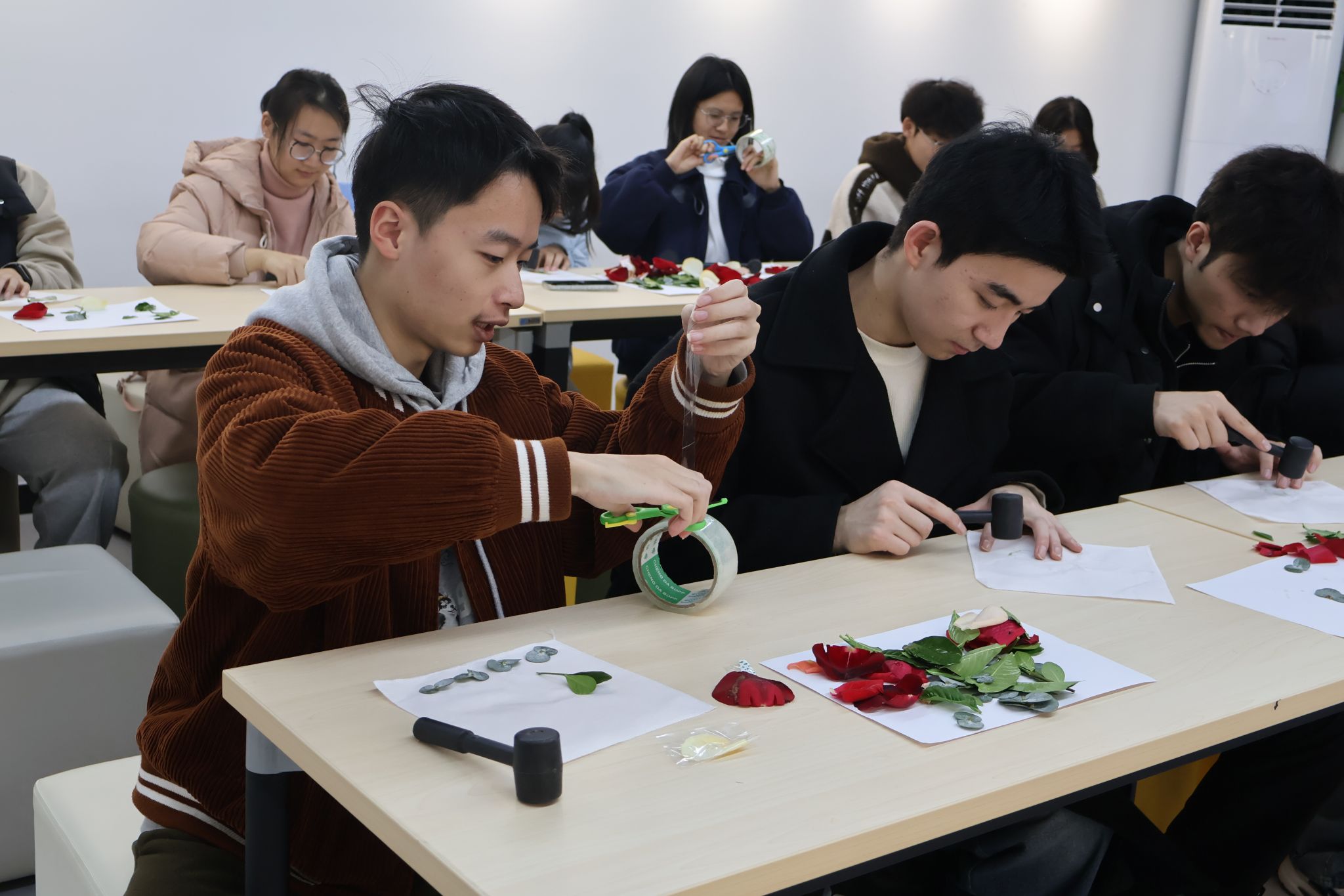 在充分的观摩学习后,现场同学们积极地投身到植物拓然的实践当中。选定一捧花、一束草,通过精心巧思的摆放设计,利用小锤子在布料上进行充分捶打,将树叶与花瓣的颜色深深拓染在布料上,将零散的枝叶花朵转化成一幅幅生动的“自然佳作”印制在手帕上。最后,同学们将布料置于准备好的明矾水中进行锁色。