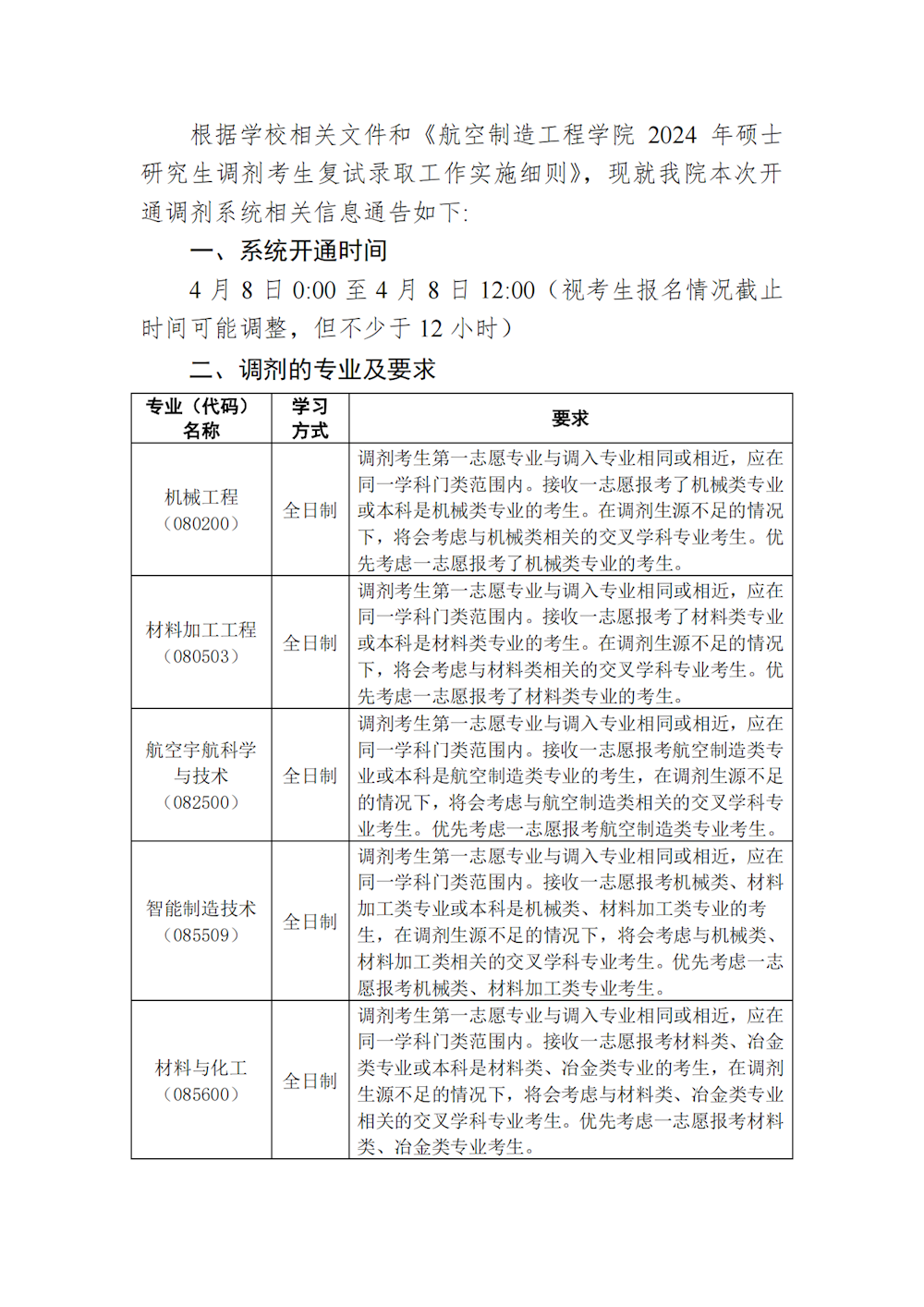 航空制造工程禁漫天堂 关于开通调剂系统相关信息的通告 来源: 发布时间:2024-04-07 14:43:54 浏览次数: 次 【字体:小 大】 航空制造工程禁漫天堂 关于开通调剂系统相关信息的通告.pdf 责任编辑:袁源平1 【打印正文】